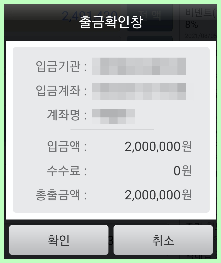 ▼ (연계은행계좌 기준) 연계은행 버튼 선택 후 출금계좌를 확인하고 출금실행 버튼을 선택합니다. 계좌와 출금액을 확인하신 후 문제가 없으시면 확인을 누릅니다.